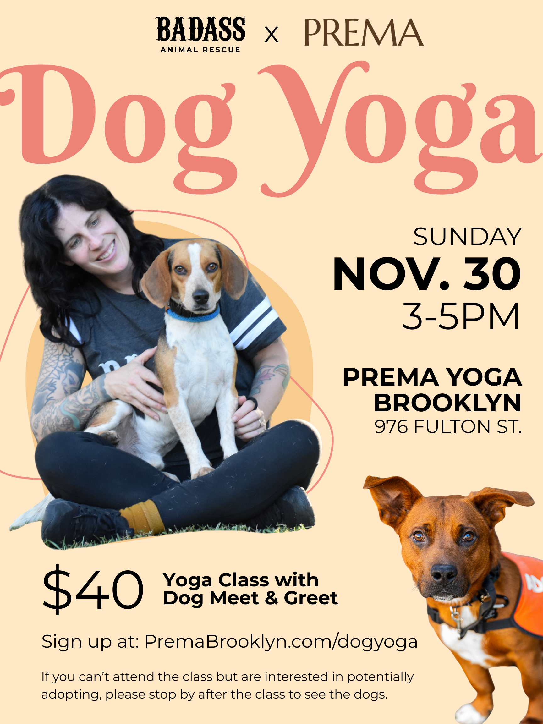 Join Badass Animal Rescue and Prema Yoga for a dog-friendly yoga class on November 30th at 3 p.m. You might just meet your new best friend! (And if you can’t make the class but are interested in adopting, feel free to stop by afterward and meet the dogs.)