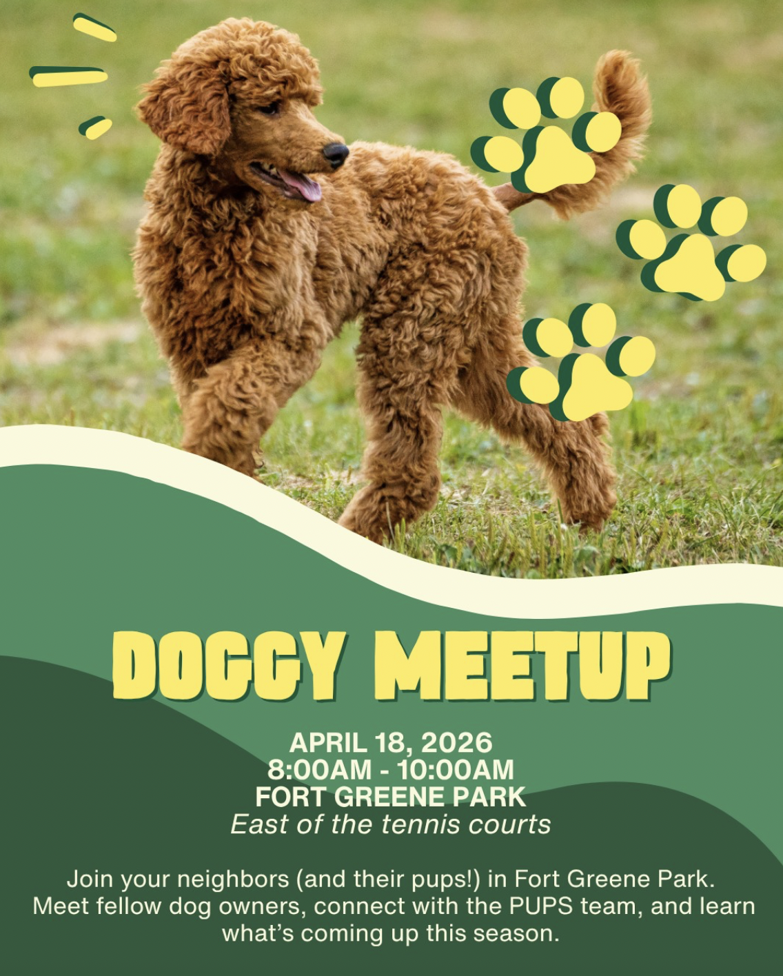 Mark your calendars 🐾 Join us for a PUPS Doggy Meetup on April 18 from 8–10 AM in Fort Greene Park (east of the tennis courts).