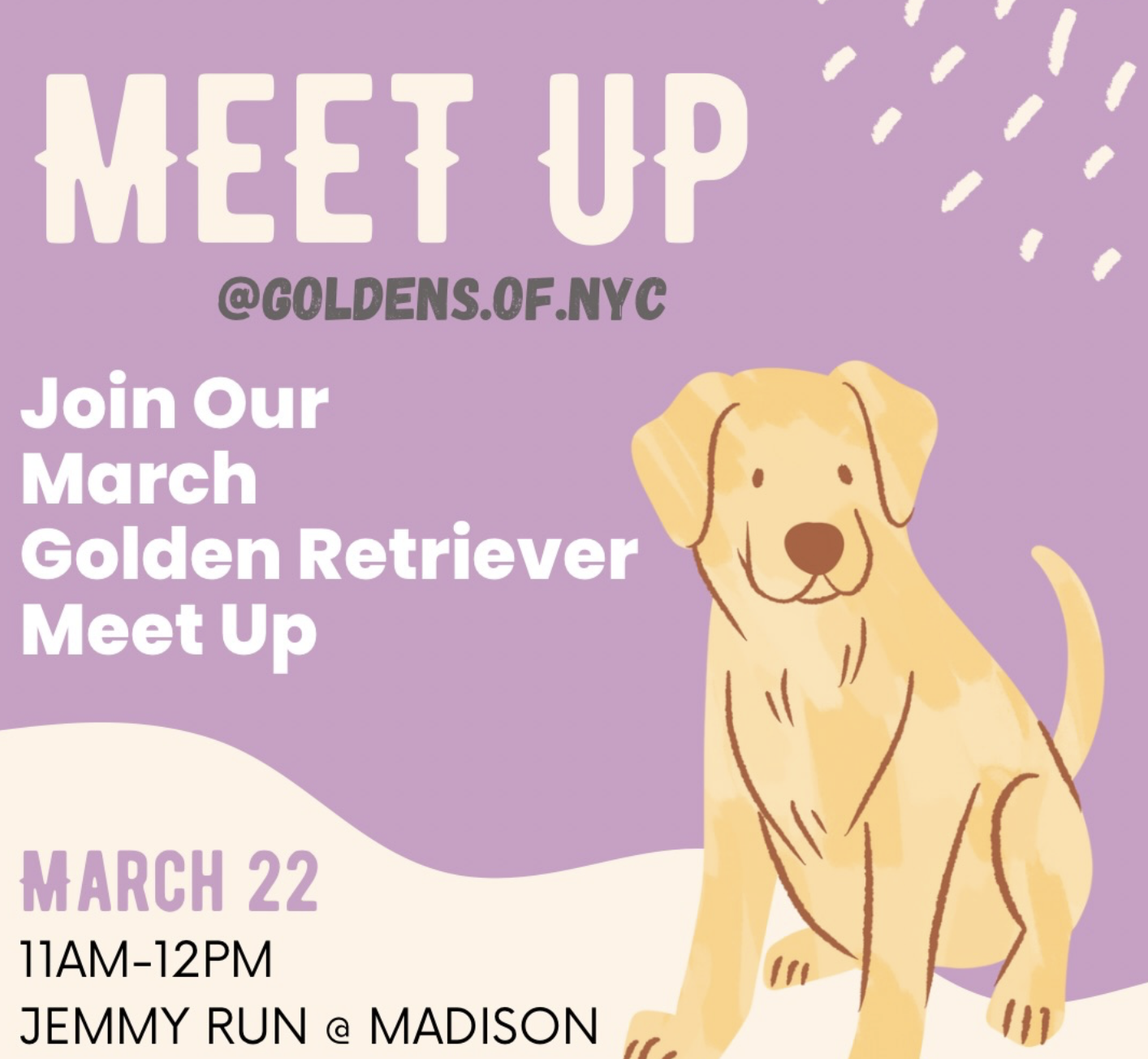 Organizer @goldens.of.nyc Location Jemmy's Dog Run Jemmy's Dog Run, Broadway, New York, NY Category Meet Up Date Mar 22 2026 Time 11:00 am - 12:00 pm Golden Retriever Monthly Meetup Join our March Meet Up at Madison Square Park! We hope to see you all there 🦮🐾 Share this event X + Add to Google Calendar + iCal / Outlook export 00 days 00 hours 00 minutes 00 seconds