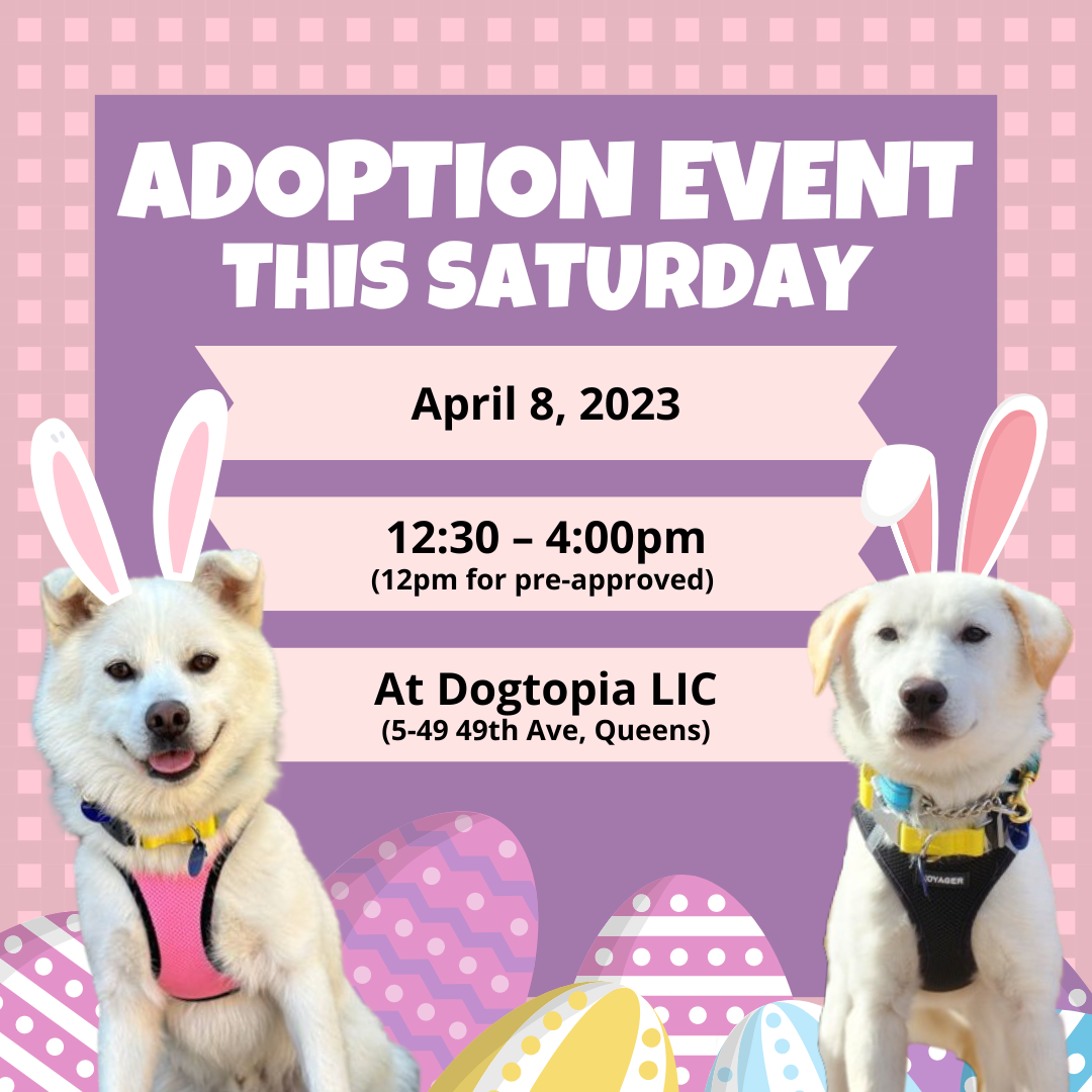 Come to our indoor adoption event Saturday, April 8th at Dogtopia LIC (5-49 49th Ave, Long Island City, NY 11101). This event is from 12-12:30pm for pre-approved adopters and then open to the general public from 12:30-4pm!