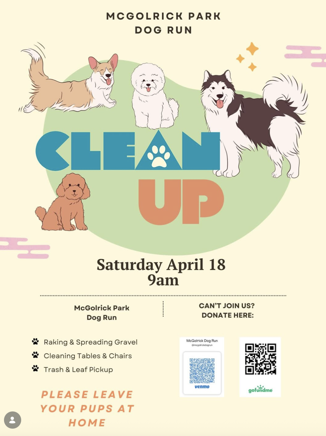 Saturday April 18 at 9am in the McGolrick Park Dog Run.
