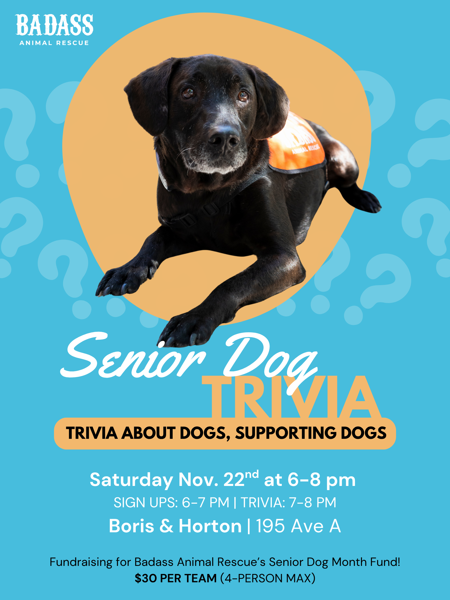 It’s Senior Dog Month! Join Badass Animal Rescue at Boris & Horton on November 22nd to support senior dogs in need and play fun trivia.